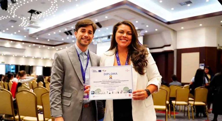Startup brasileira Super NINA vence o Prêmio “Rumbo a la Equidad”, maior reconhecimento da União Europeia e da GIZ para iniciativas que enfrentam a violência de gênero na mobilidade urbana. Na imagem acima, André Carvalho, Gerente Jurídico da Super NINA, e a CEO Simony César. Foto: Alejo Rivera/TransMilenio