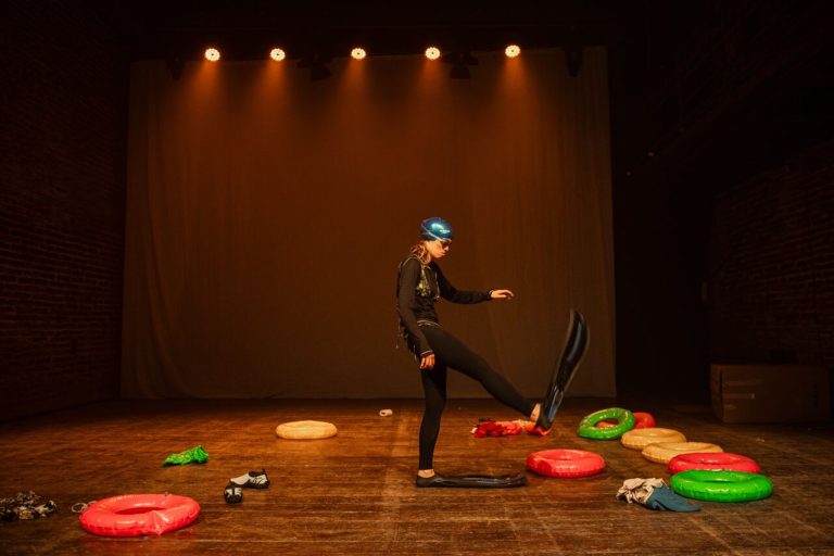Com dramaturgia original e atuação de Vitória Vasconcellos e direção de Lucas Carvalho, o espetáculo transita entre o cômico e o trágico, utilizando o corpo da atriz, a palavra e as imagens projetadas como recursos narrativos que tensionam as fronteiras entre teatro e audiovisual. A piscina assume diferentes significados cênicos, funcionando como espaço de confinamento voluntário, palco de exposição pública e metáfora do isolamento contemporâneo, aproximando o público de uma experiência ao mesmo tempo íntima e coletiva.